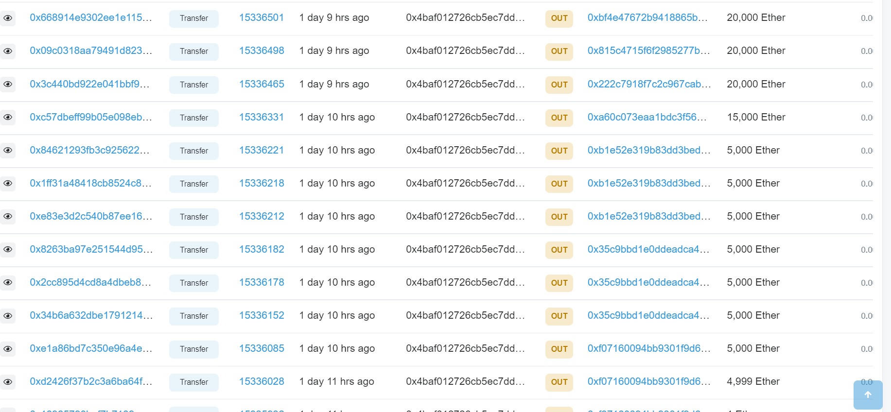 The whale address transferred 145,000 ETH to multiple wallets as Ether price surged to a new 3-month high of over $2,000. The transfers were made in a batch of 5,000 ETH per transaction and a few transfers of over 10,000 ETH. The total value of the transferred ETH is over $280 million, and the wallet address currently has a balance of 0.107 ETH.