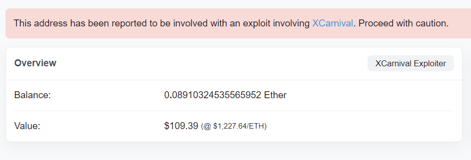 XCarnival was attacked on June 26, 2022 and suspended part of the protocol. XCarnival officials will give 0xb7CBB4d43F1e08327A90B32A8417688C9D0B800a owner 1500 ETH bounty.