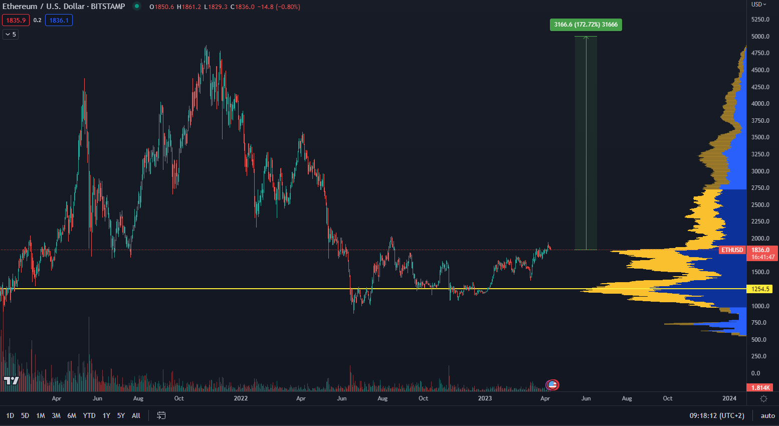 Podľa údajov z TradingView sa trhová cena etherea v čase písania článku nachádza na cenovej úrovni 1 836 dolárov. To znamená, že dosiahnutie hodnoty 5 000 dolárov vyžaduje rastúci trend o sile 172 % od súčasnej hodnoty.
