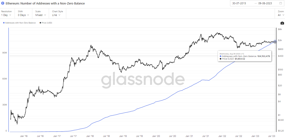 V čase písania článku existuje na ethereovej sieti až 104 153 479 adries s aspoň nejakým minimálnym objemom ETH. Presne pred rokom existovalo týchto adries presne o 20 miliónov menej a pred dvoma rokmi až o 44 miliónov menej. Je to obzvlášť pozoruhodné, keďže cena etherea počas posledného roka prevažne klesala.