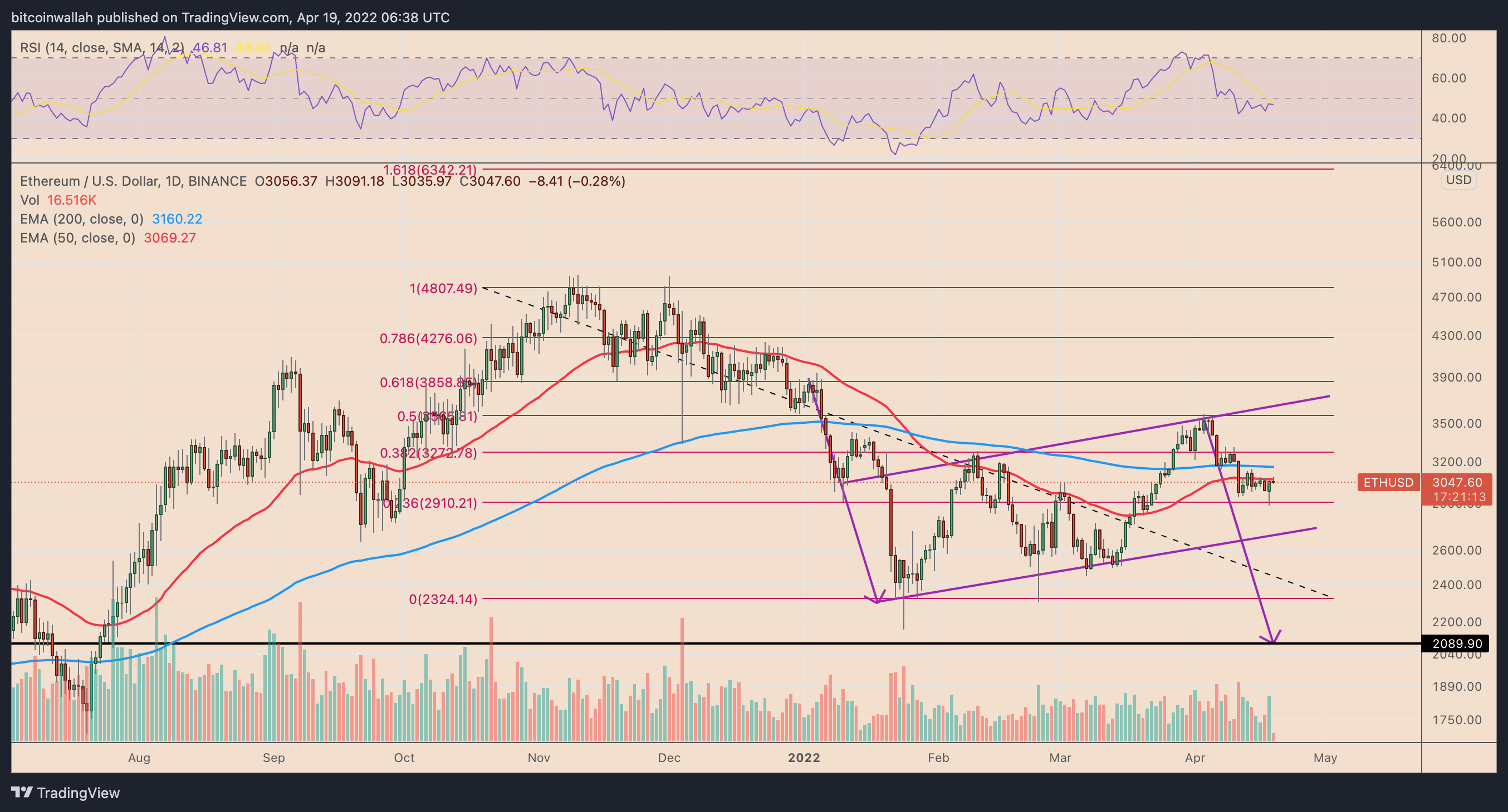 https://images.cointelegraph.com/images/840_aHR0cHM6Ly9zMy5jb2ludGVsZWdyYXBoLmNvbS91cGxvYWRzLzIwMjItMDQvNDM3N2FhNWYtODhlZS00MDRmLWI4MzktNTc5Y2FmYjNkZjViLmpwZw==.jpgEthereum’s native token Ether (ETH) has dropped by nearly 20% in the last three weeks, hitting monthly lows near $2,900 on April 19. But despite rebounding above $3,000 since, technicals suggest more downside is possible in the near term, according to a classic bearish pattern.
