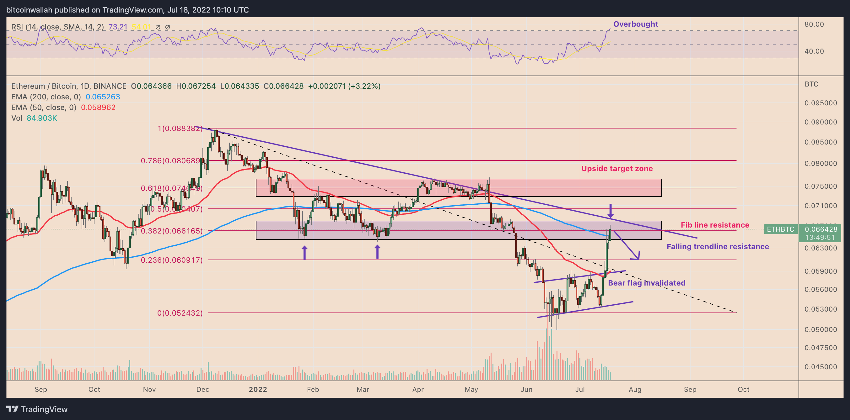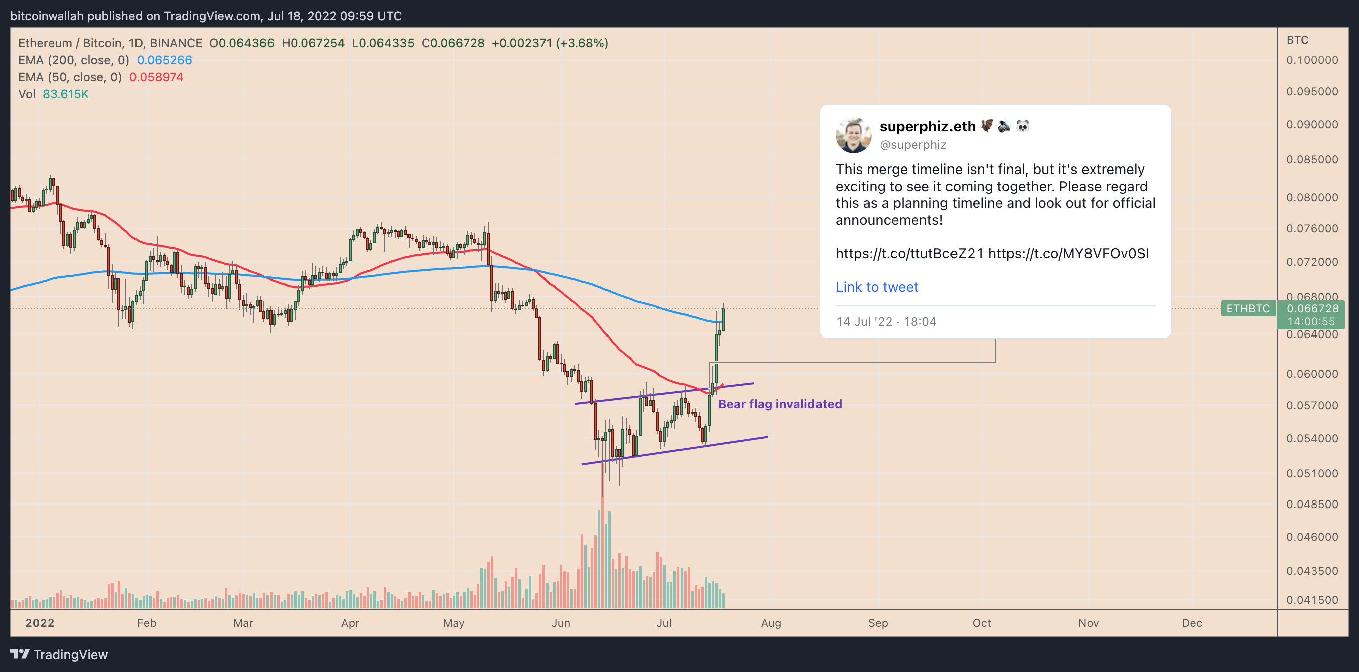 The ETH/BTC pair invalidated its prevailing “bear flag” pattern after Ethereum developers announced this July 14 that their long-awaited switch to proof-of-stake (called the Merge) will most likely occur in September.