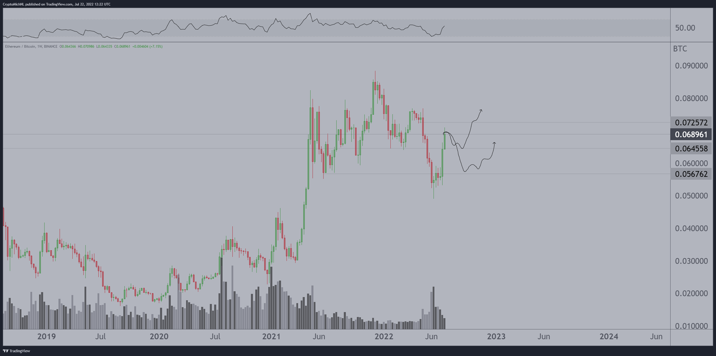 Van de Poppe anticipates ETH/BTC to test 0.072, the cup-and-handle profit target, as interim resistance while holding either 0.0645 or 0.057 level as support.