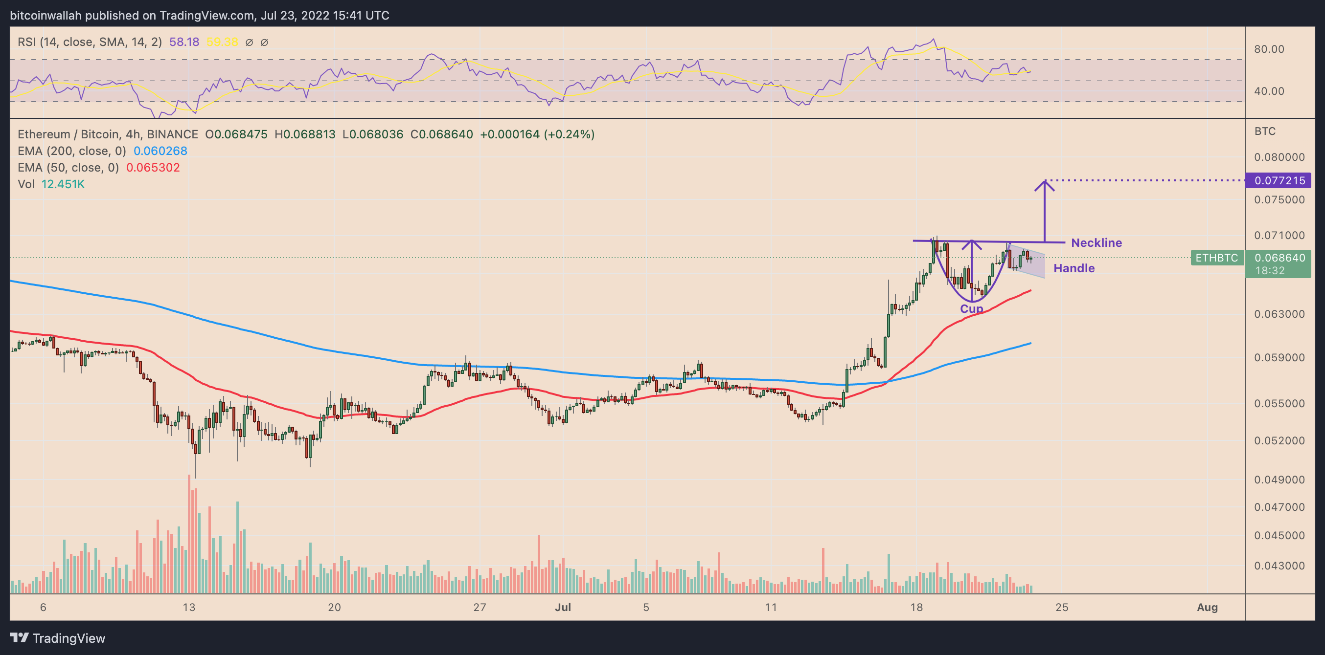 Specifically, ETH/BTC has been forming a “cup and handle” on its lower-timeframe charts since July 18.