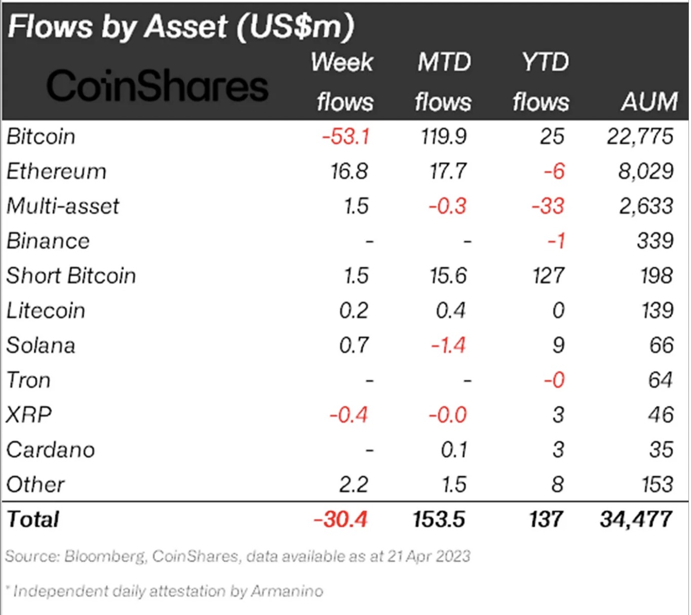 As for Bitcoin, the outflow began around April 14 when the coin reached $30,000, a psychological resistance level. Butterfill said the BTC’s drop to below $27,500 resulted from profit-taking in the absence of macroeconomic triggers.