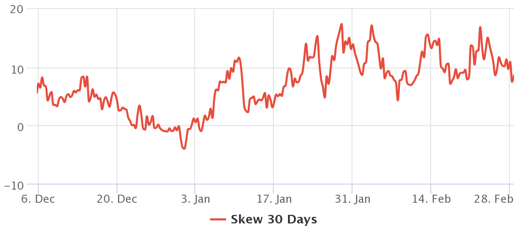 The above chart shows that Ether option traders have been signaling bearishness since Feb. 11, just as Ether failed to break the $3,200 resistance. Furthermore, the current 8.5% reading shows no confidence from market markers and whales despite the 7.5% price increase on Feb. 28.