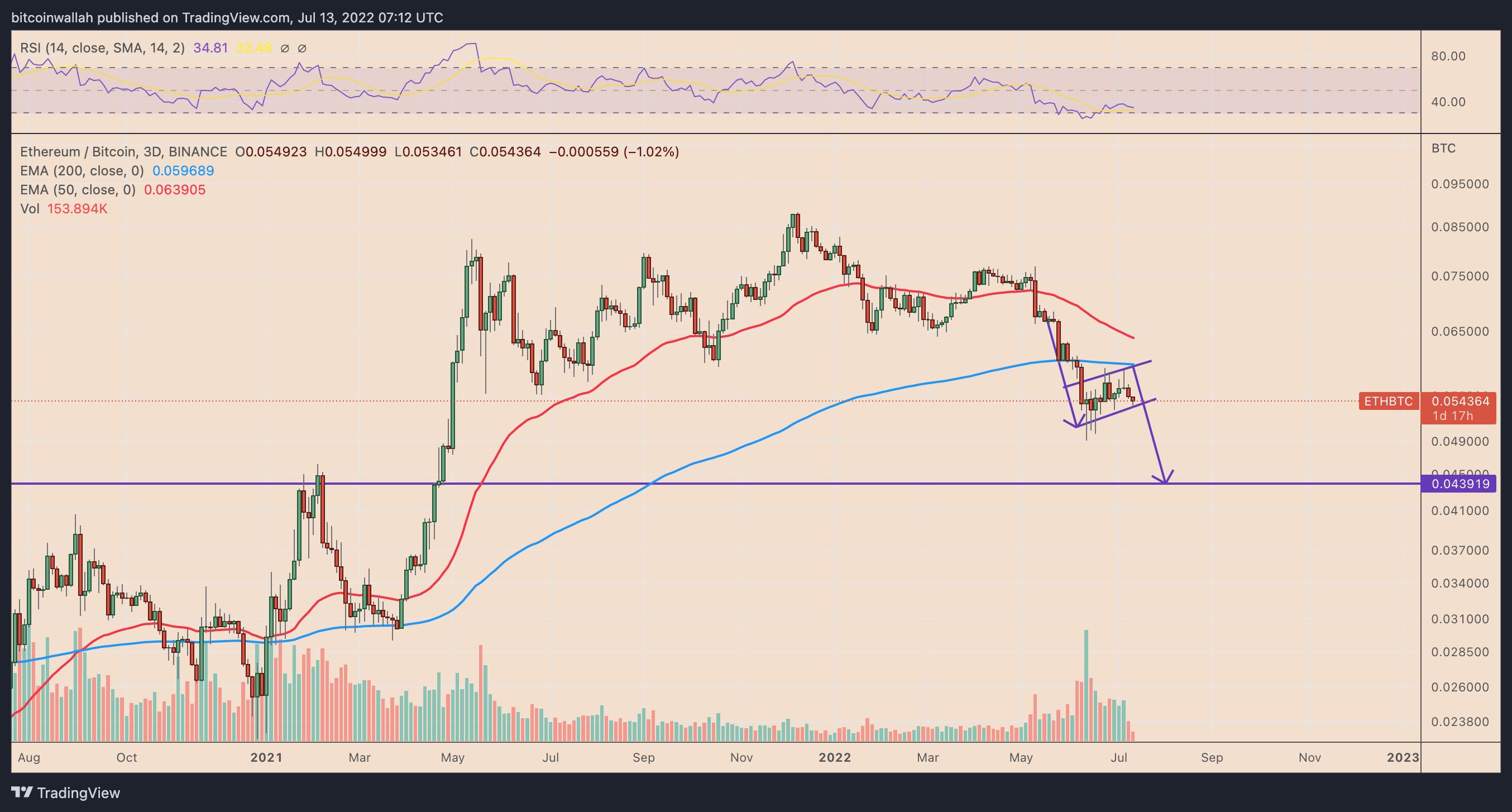 The ETH/BTC chart has been forming a bear flag since early June 2022 on the three-day timeframe.