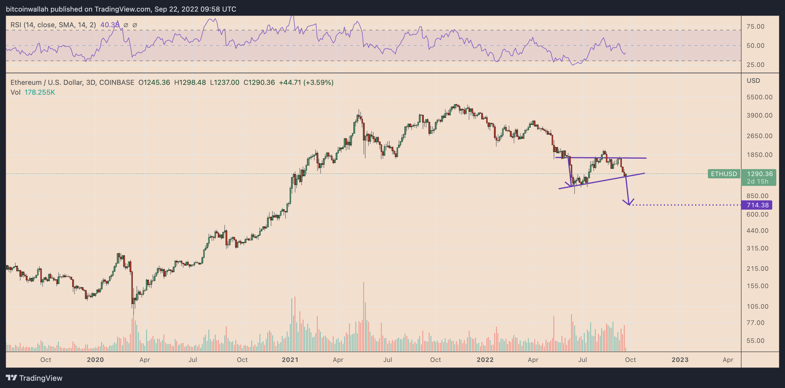 As a rule, the bearish continuation pattern resolves after the price breaks below its lower trendline and then falls by as much as its maximum height. Hence the bearish target sits near $700 by the end of this year, down 45% from today’s price.