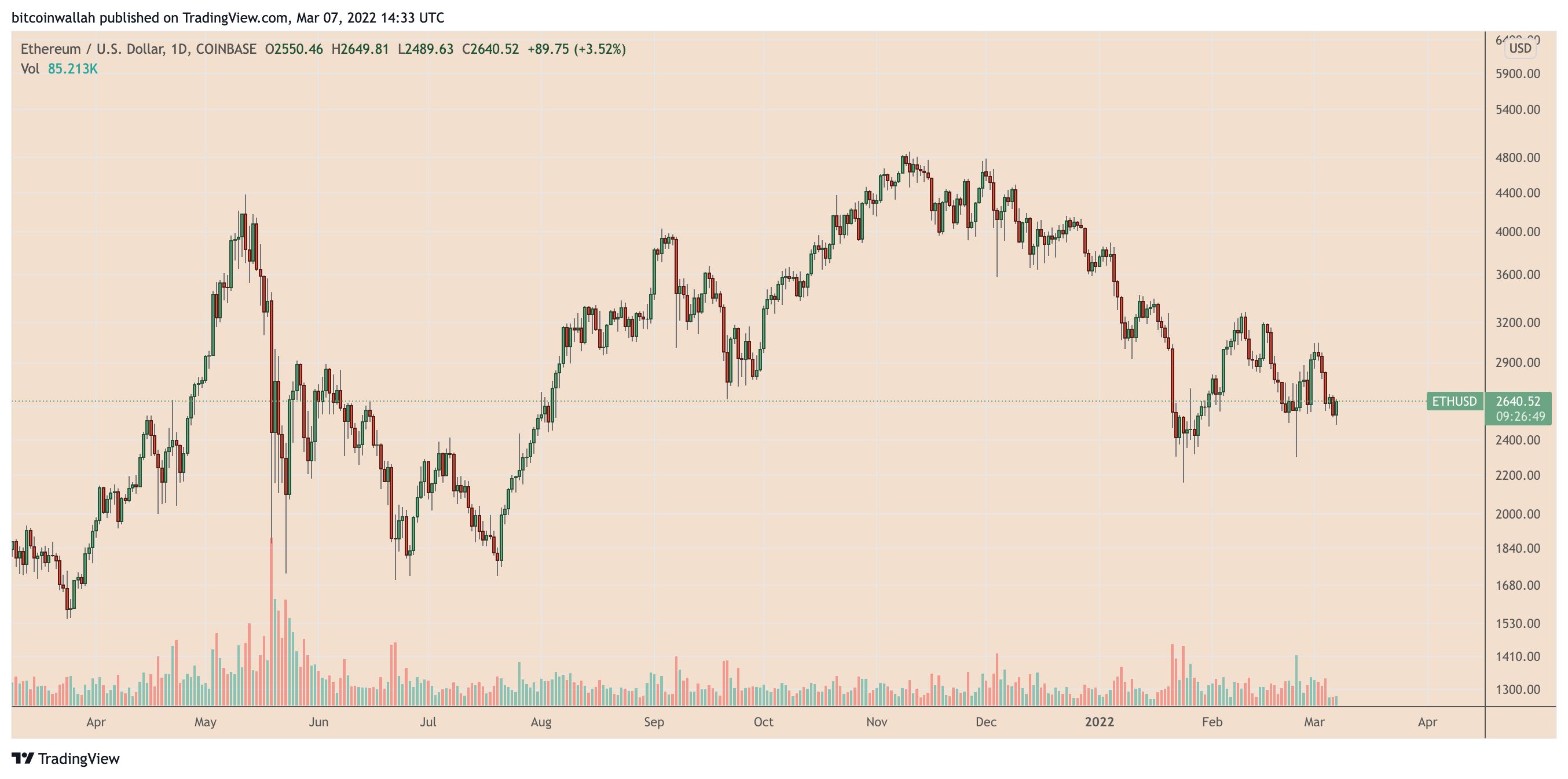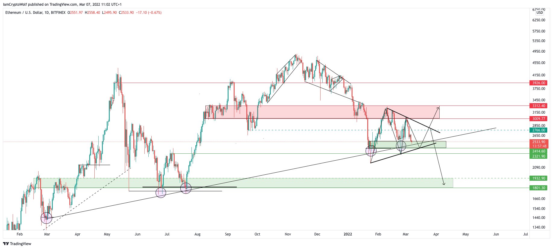 Pseudonymous market analyst Wolf shared the downside outlook on March 7 as Ether’s price rebounded by over 3% to nearly $2,650, a day after testing its upward sloping trendline near $2,500.