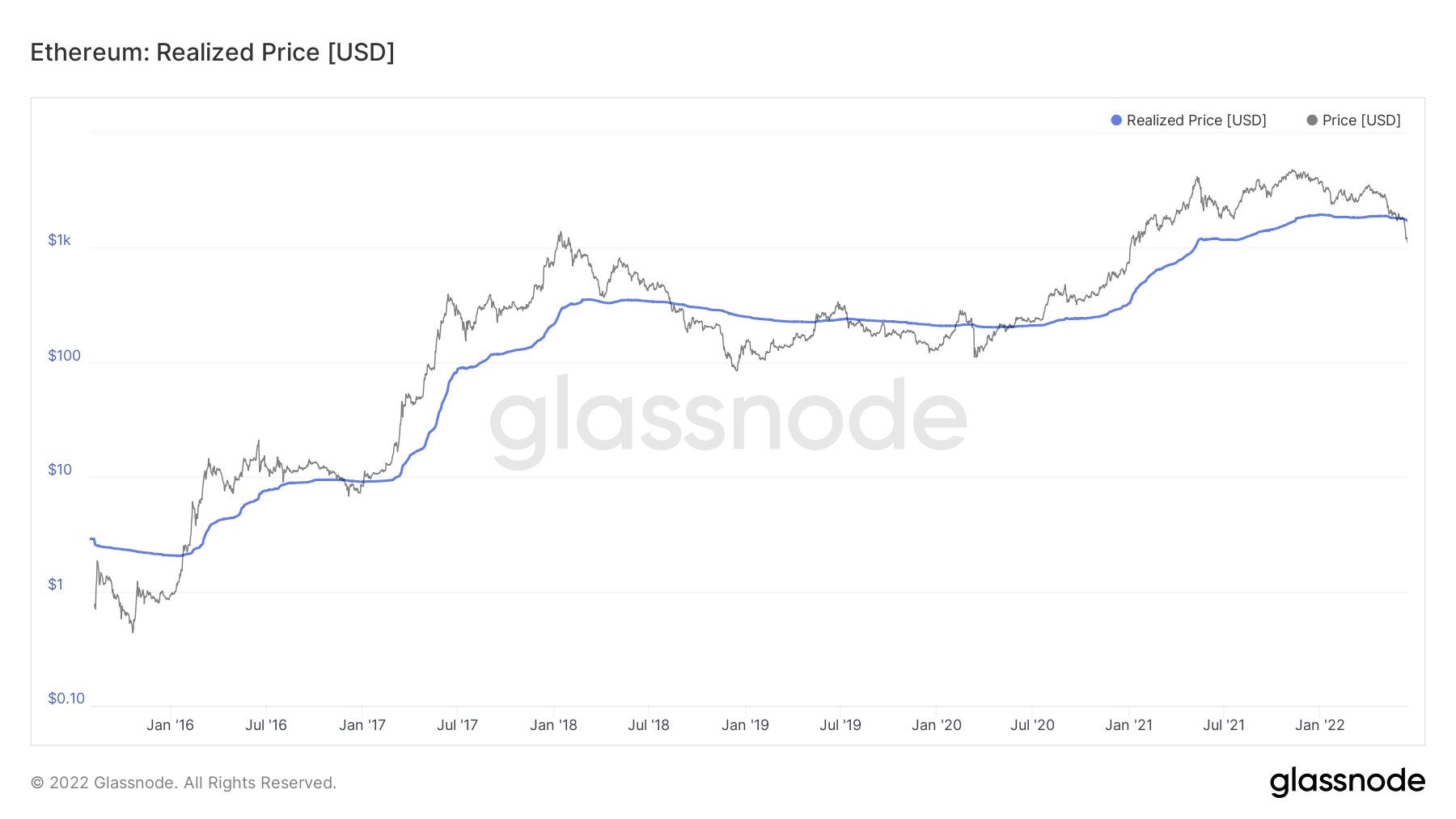 The decline means that Ether has shed 77% of its value since November 2021 and is now trading below its “realized price” of $1,740, data from Glassnode shows.