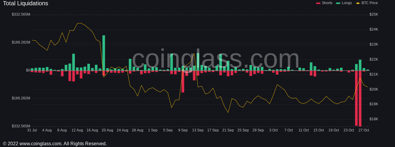 According to the latest figures from on-chain analytics resource Coinglass, Oct. 25 and 26 saw $328 million and $332 million of short liquidations, respectively, across exchanges.