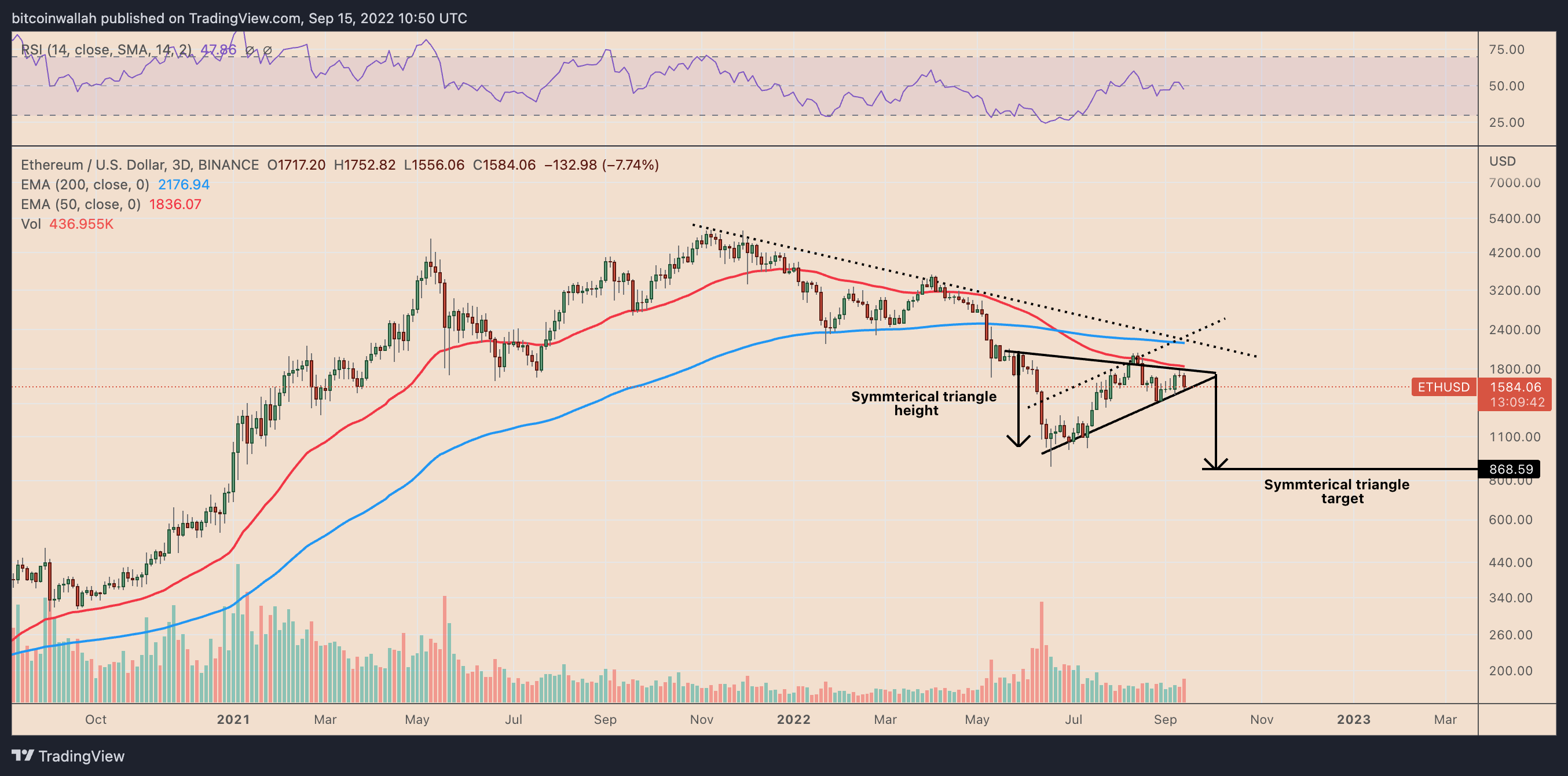 From a technical perspective, Ether’s price risks dropping by 50% in the coming weeks due to the formation of a symmetrical triangle on its longer-timeframe chart.