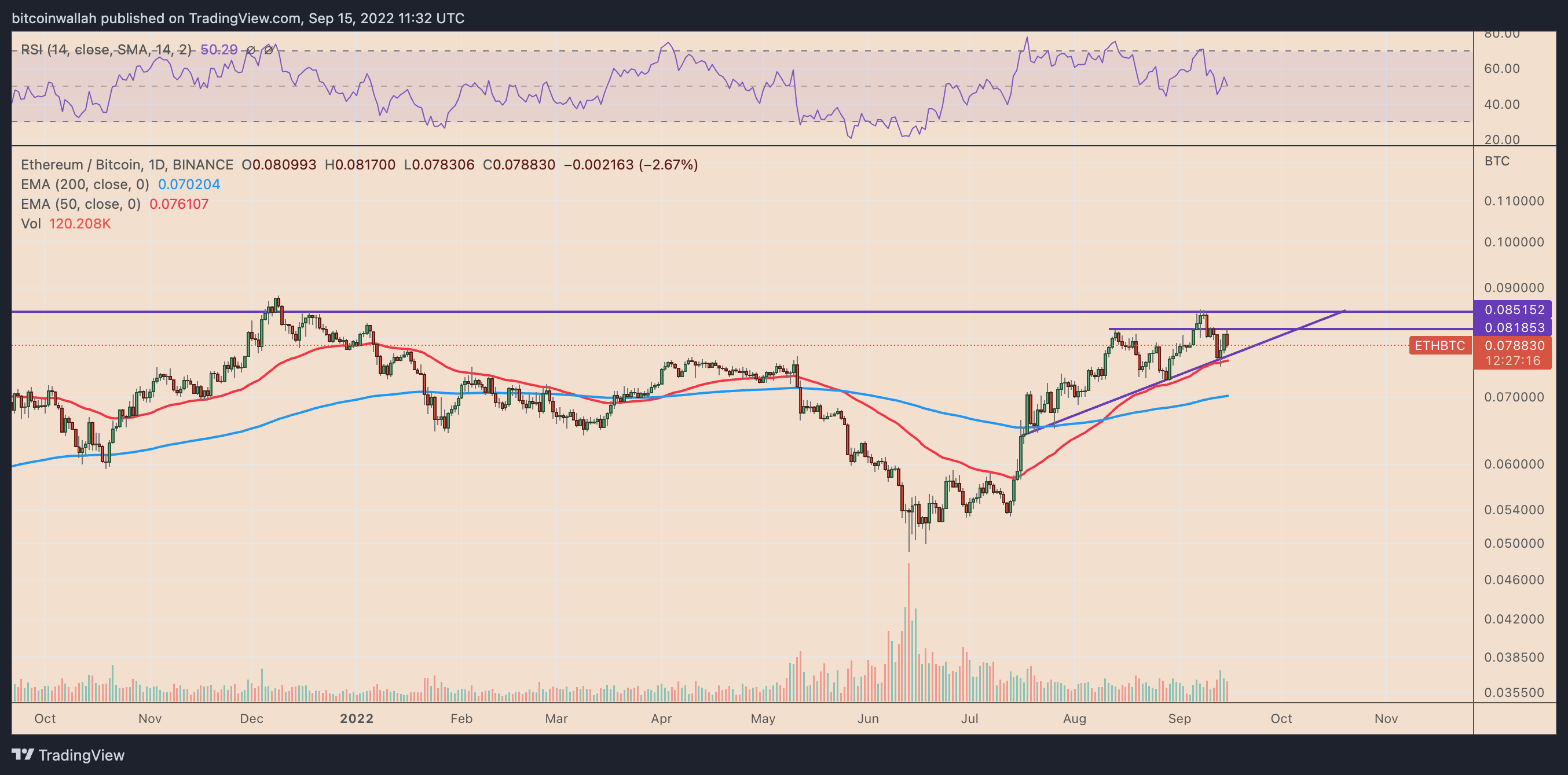 On the daily chart, ETH/BTC dropped to 0.078 BTC on Sep. 15, almost a week after topping out at 0.085 BTC. The pair’s correction came after a strong bull cycle, wherein its price rose by more than 75% in less than three months.