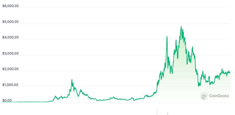 A little more than a year after DeFi summer, Ether notched its all-time-high of $4,878 on Nov. 10, 2021. At the time of writing ETH is changing hands for $1,869.