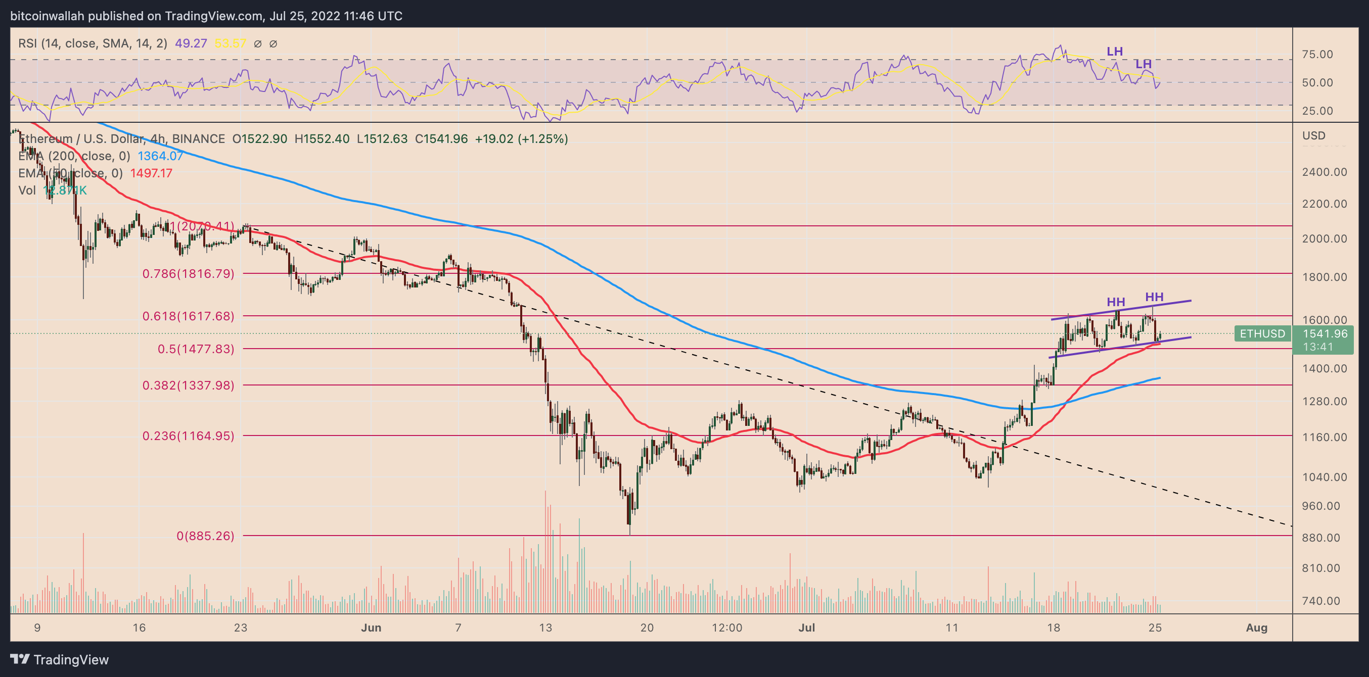 Ether also risks breaking below its ascending channel’s lower trendline, which coincides with two more price supports: the 50-4H exponential moving average (50-4H EMA; the red wave) at around $1,500 and the 0.5 Fib line near $1,475.