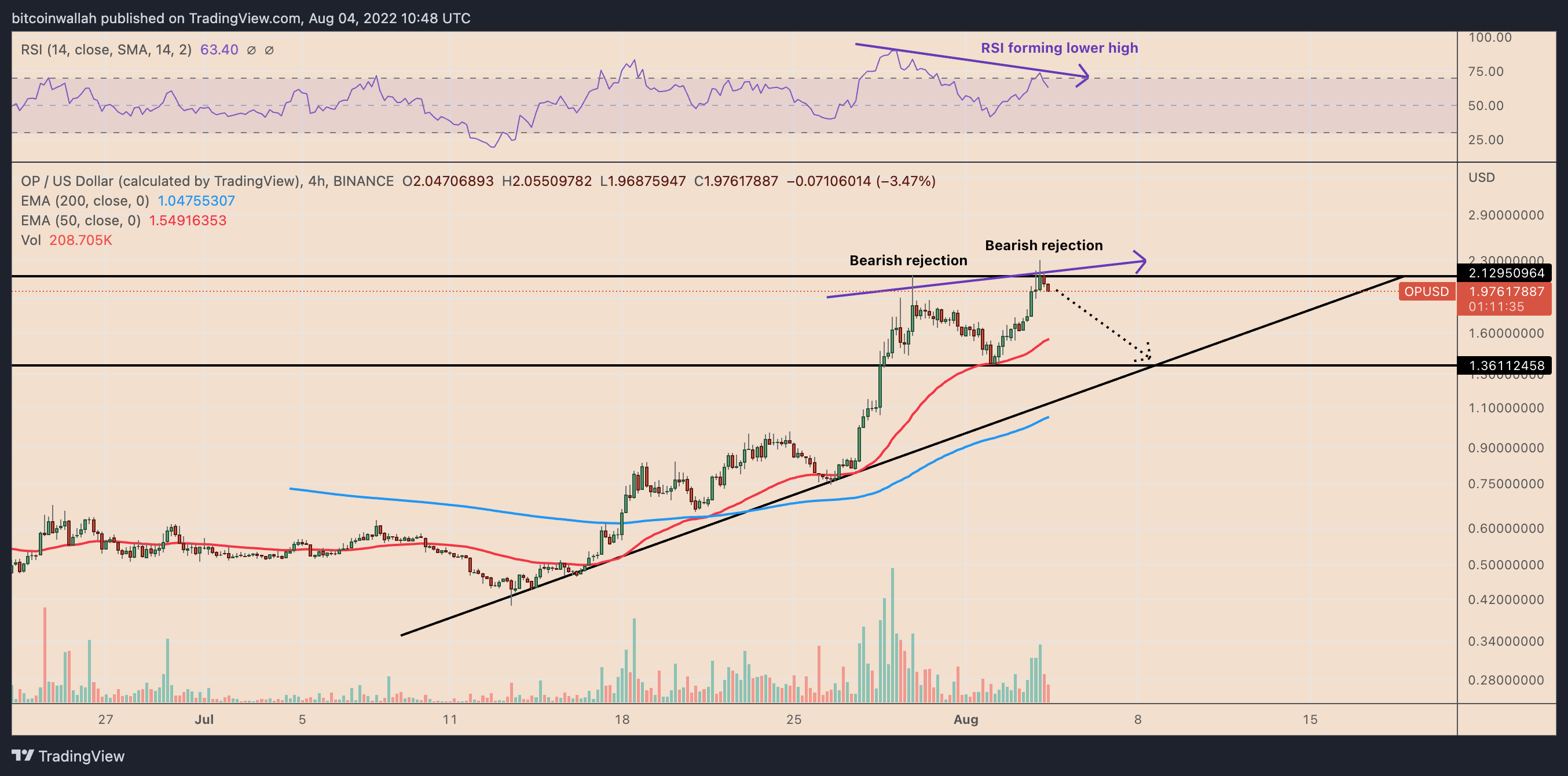On the four-hour chart, OP’s rising price coincides with its falling relative strength index (RSI), indicating “bearish divergence.” Meanwhile, the attempted breakout above the $2-level has faced strong rejection twice since July 29, including its 15% drawdown after peaking out locally at $2.31 on Aug. 4.