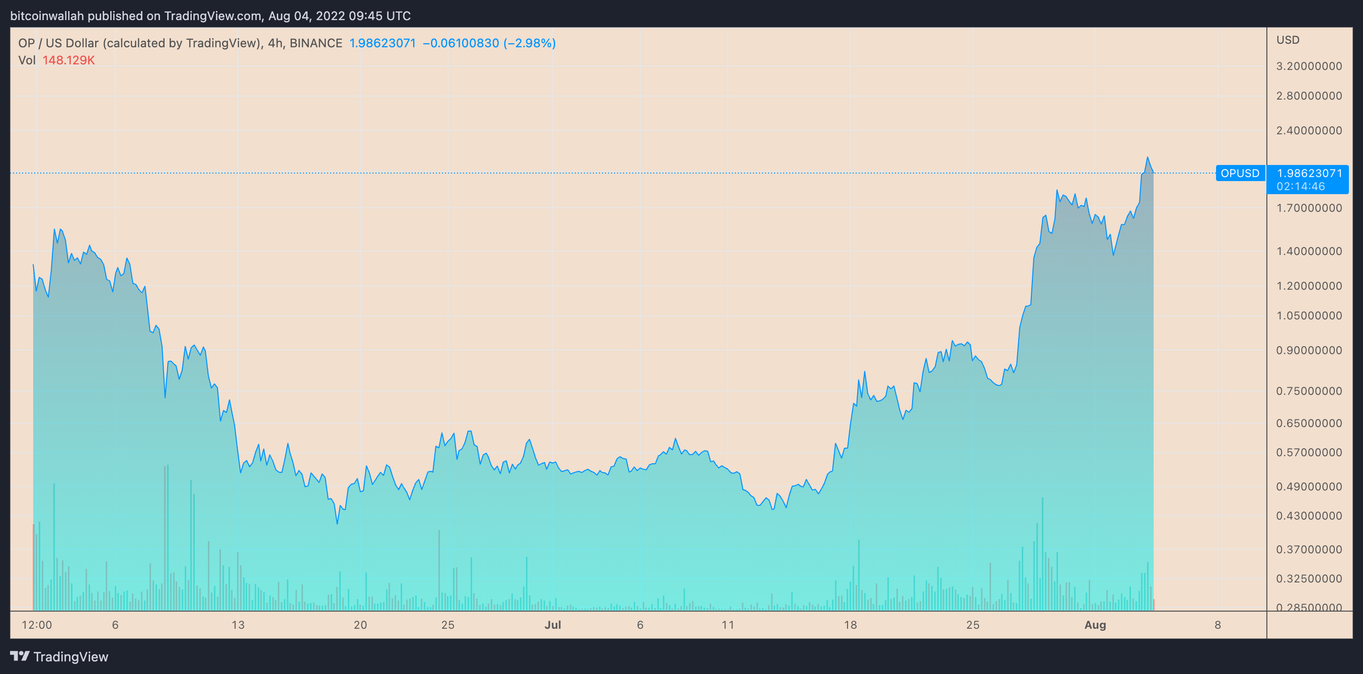 https://images.cointelegraph.com/images/840_aHR0cHM6Ly9zMy5jb2ludGVsZWdyYXBoLmNvbS91cGxvYWRzLzIwMjItMDgvZTFmZWNjOTgtZDkyMy00MWZiLTgzZWUtYjRhOWNhZjlhZWQ3LmpwZw==.jpgThe price of Optimism (OP) has been skyrocketing since the beginning of July due to its proximity to Ethereum.