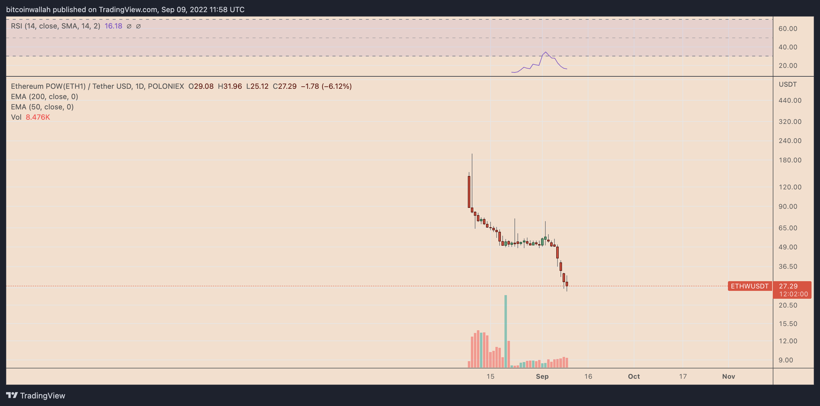 On the daily chart, ETHW’s price dropped by more than 80% to $25 on Sept. 10, over a month after its market debut.