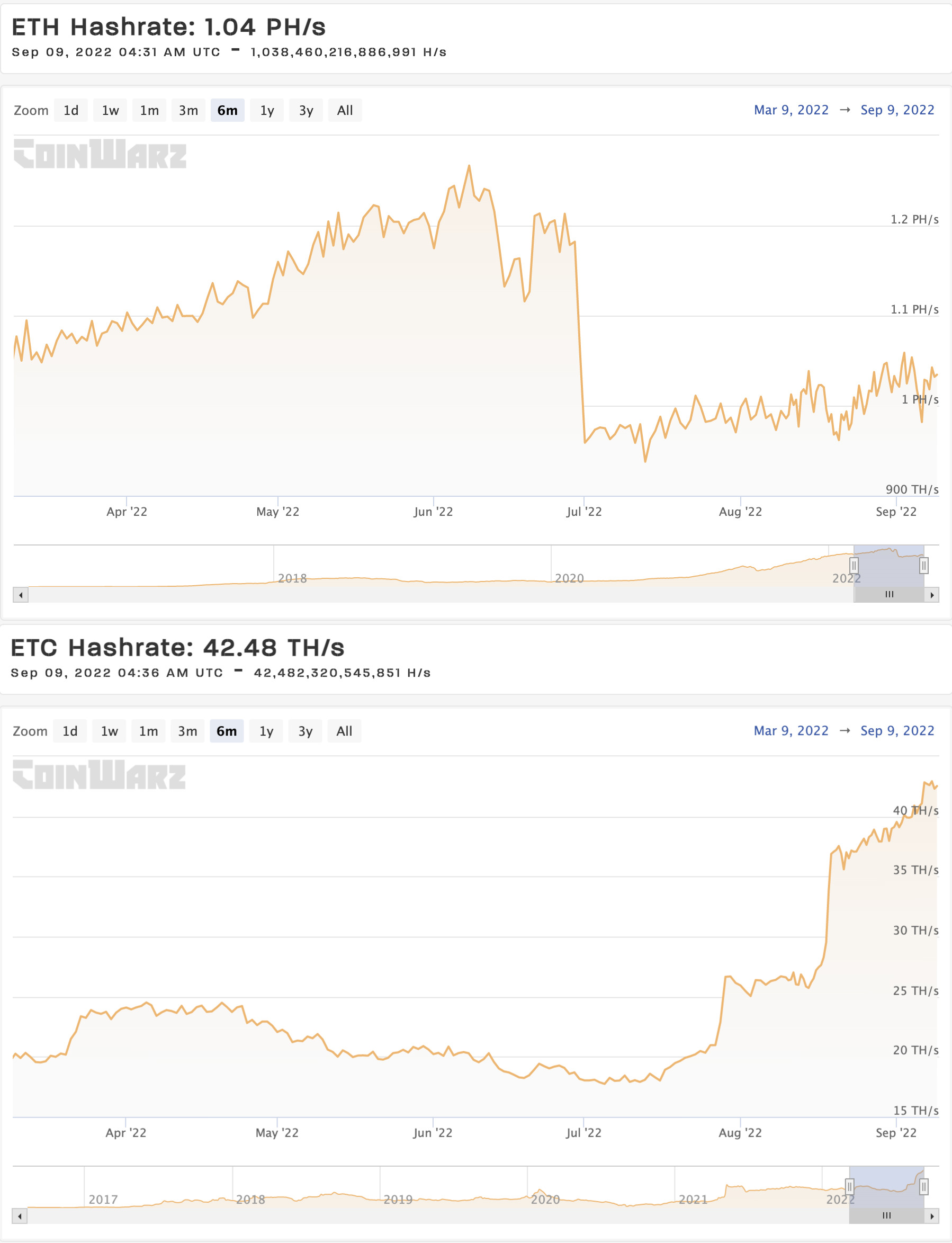 For instance, the chart below shows Ethereum Classic’s hashrate rising and Ethereum’s hash rate dropping in the days leading up to the Merge.