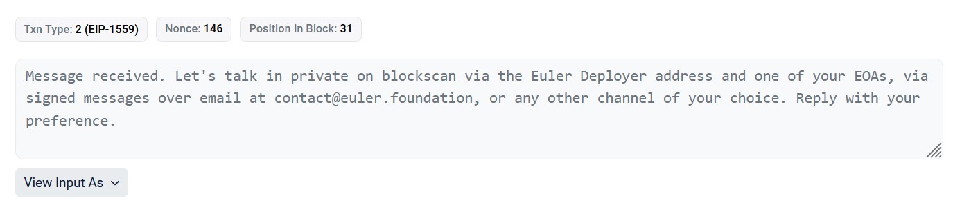“Message received. Let’s talk in private on blockscan via the Euler Deployer address and one of your EOAs, via signed messages over email at contact@euler.foundation, or any other channel of your choice. Reply with your preference.”
