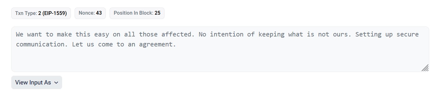 “We want to make this easy on all those affected. No intention of keeping what is not ours. Setting up secure communication. Let us come to an agreement,” said the exploiter.