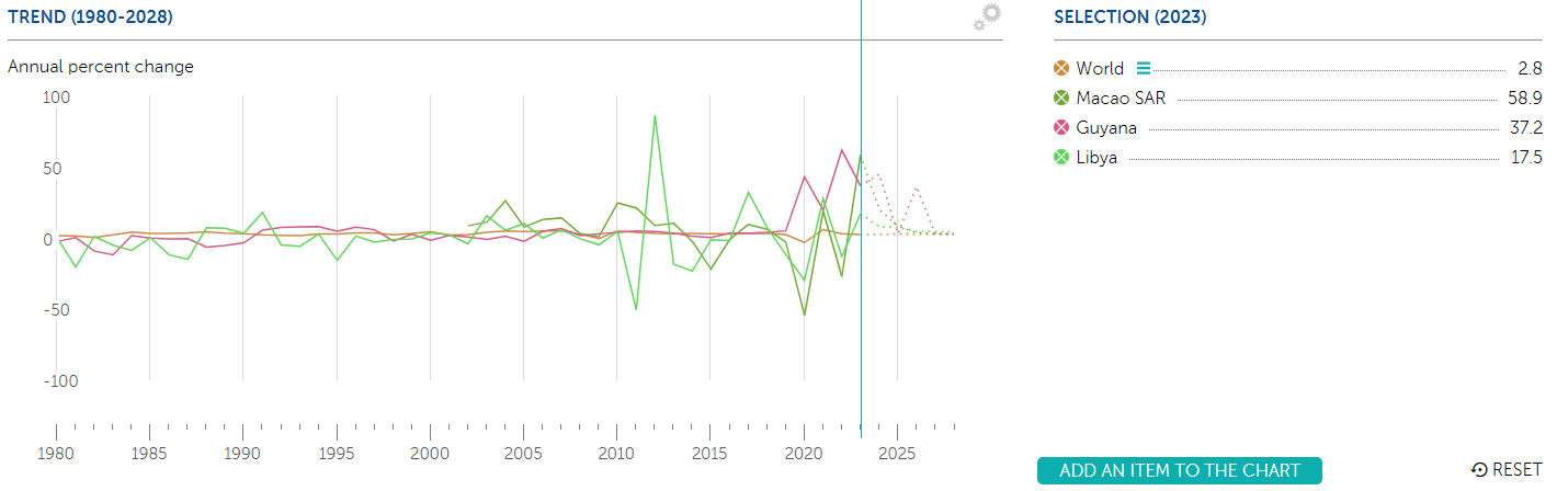 Na grafe nižšie môžete vidieť porovnanie rastu reálneho HDP celosvetovo (oranžová krivka) s troma najrýchlejšie sa rozvíjajúcimi krajinami v súčasnosti. Je zrejmé, že vysoké odchýlky od celosvetového priemeru začali byť viditeľné predovšetkým od roku 2010. Kým Macao a Líbya strieda obrovské prepady masívnymi vzostupmi, Guyana rastie stabilne už od roku 2019.