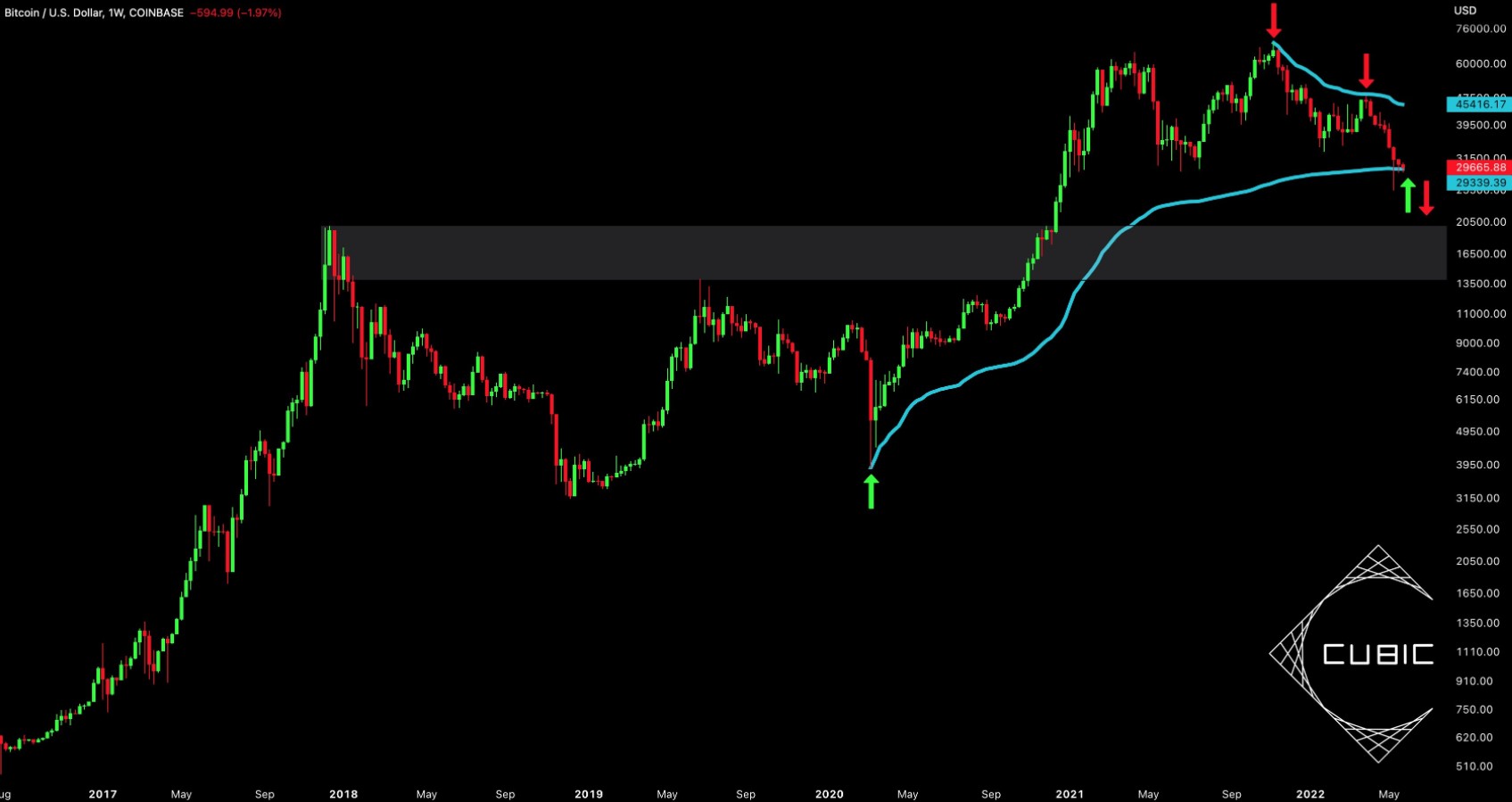 “A rebound on the weekly AVWAP from the COVID low could increase bullish probabilities. A breakdown below it would drastically increase bearish probabilities, foreshadowing a retest of the grey range, $13.8k-19.8k.”