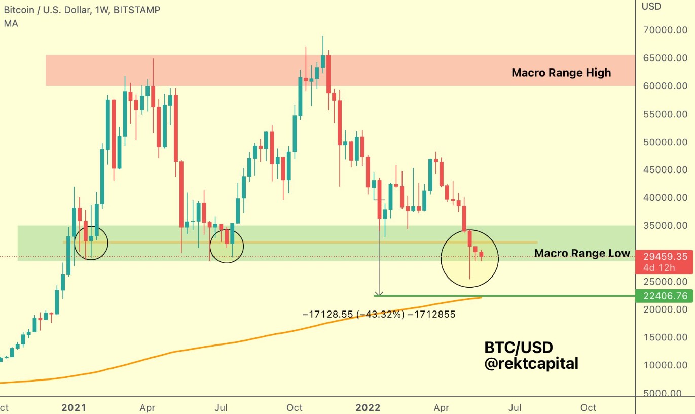 “$BTC will breakdown from the Macro Range Low support & continue its drop to complete -43% downside. The -43% mark is confluent with the 200-Week MA at ~$22500.”