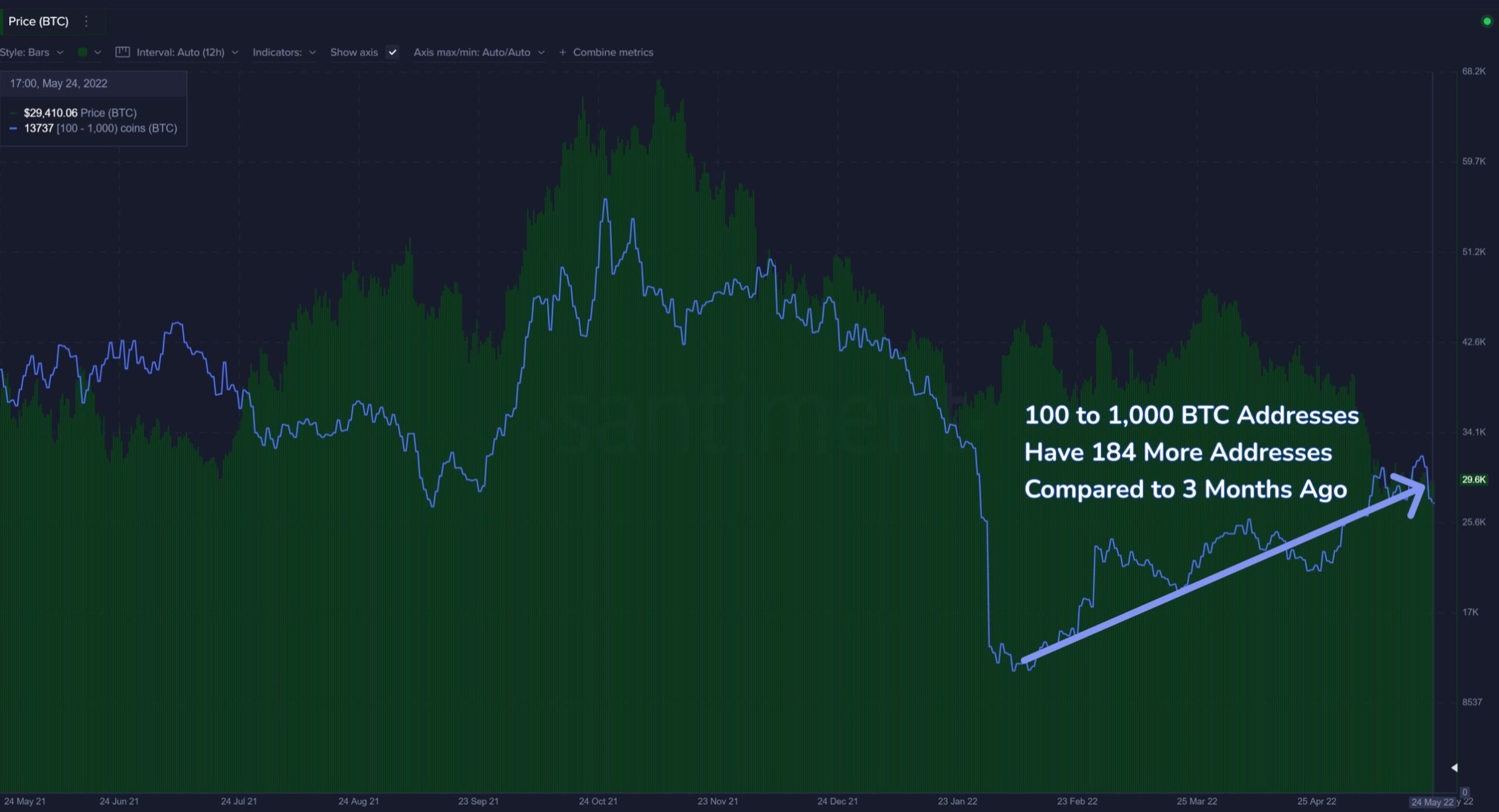 “As #Bitcoin continues treading water at $29.6K, the amount of key whale addresses (holding 100 to 1k $BTC) continues rising after the massive dumping from late January. We’ve historically seen a correlation between price & this tier’s address quantity.”