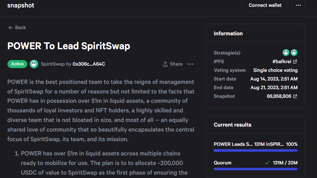 “Initially, I had requested a deposit of 20-30K to the treasury to cover the essential costs of SpiritSwap. However, the Power team is willing to go above and beyond by depositing 200,000 USDC,” wrote Nzaru, head manager at SpiritSwap, who announced that he would depart the DEX after receiving a new job offer. “On the 30th, I will finalize the new team and conduct orientation sessions to prepare for the upcoming month,” he said.
