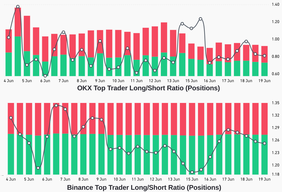 Top traders at OKX vastly decreased their shorts on June 15 as the Bitcoin price plunged to its lowest level in three months at $24,800. However, those traders were not comfortable keeping a ratio that favored longs, and it has since moved back to a 0.80 ratio, in line with the two-week average.