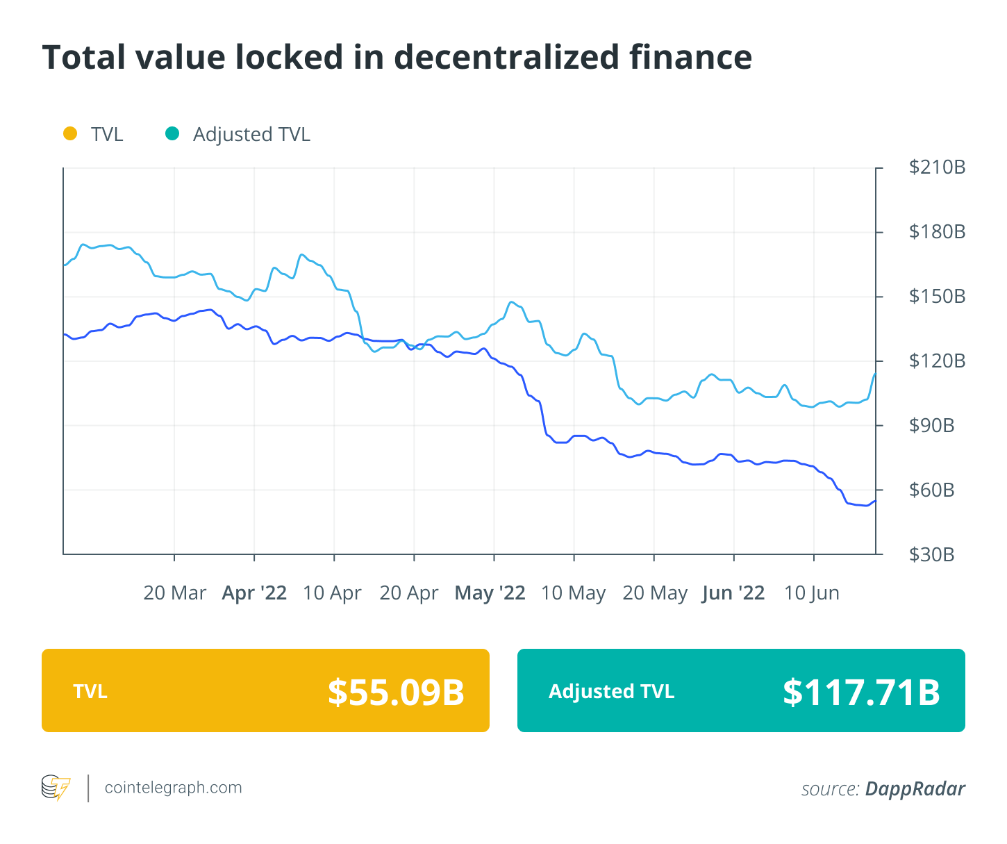 Analytical data reveals that DeFi’s total value locked registered another week of outflow over the past week, with the value dipping to $55 billion. Data from Cointelegraph Markets Pro and TradingView reveals that DeFi’s top-100 tokens by market capitalization registered a week filled with volatile price action with bears dominating the market trends.