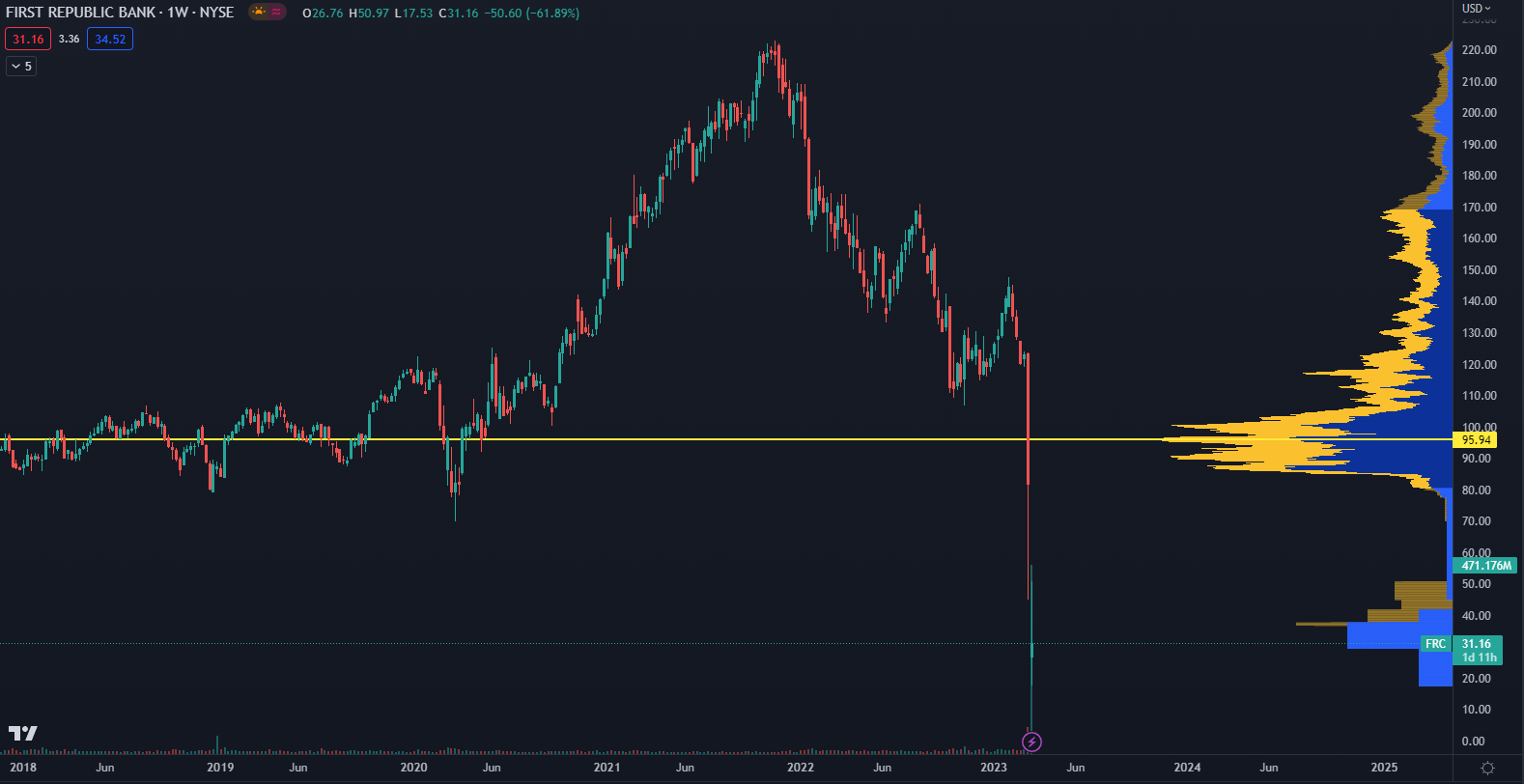Akcie FRC klesli za jediný týždeň o viac ako 64 % a naposledy sa obchodovali na rovnakej cenovej úrovni v júni 2012.