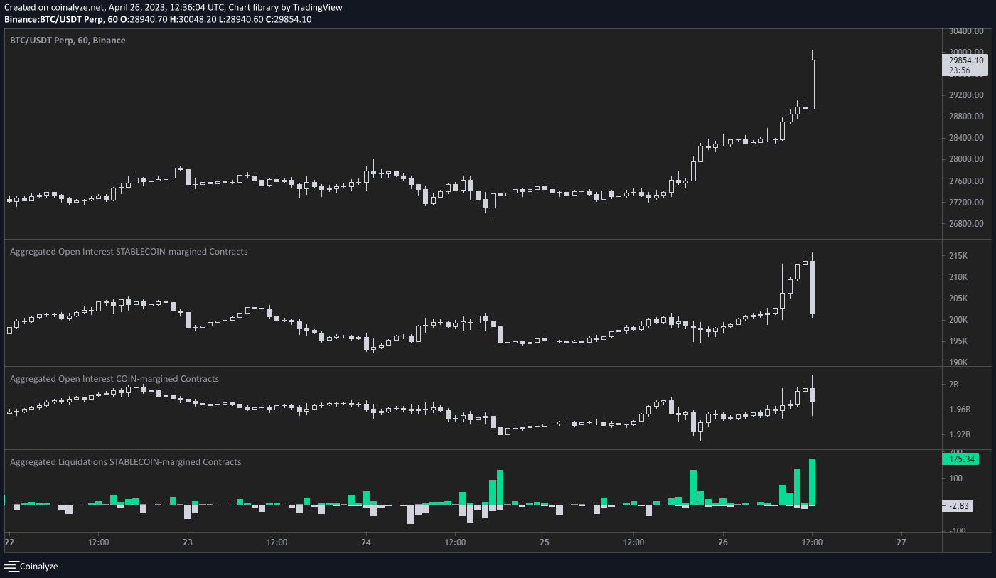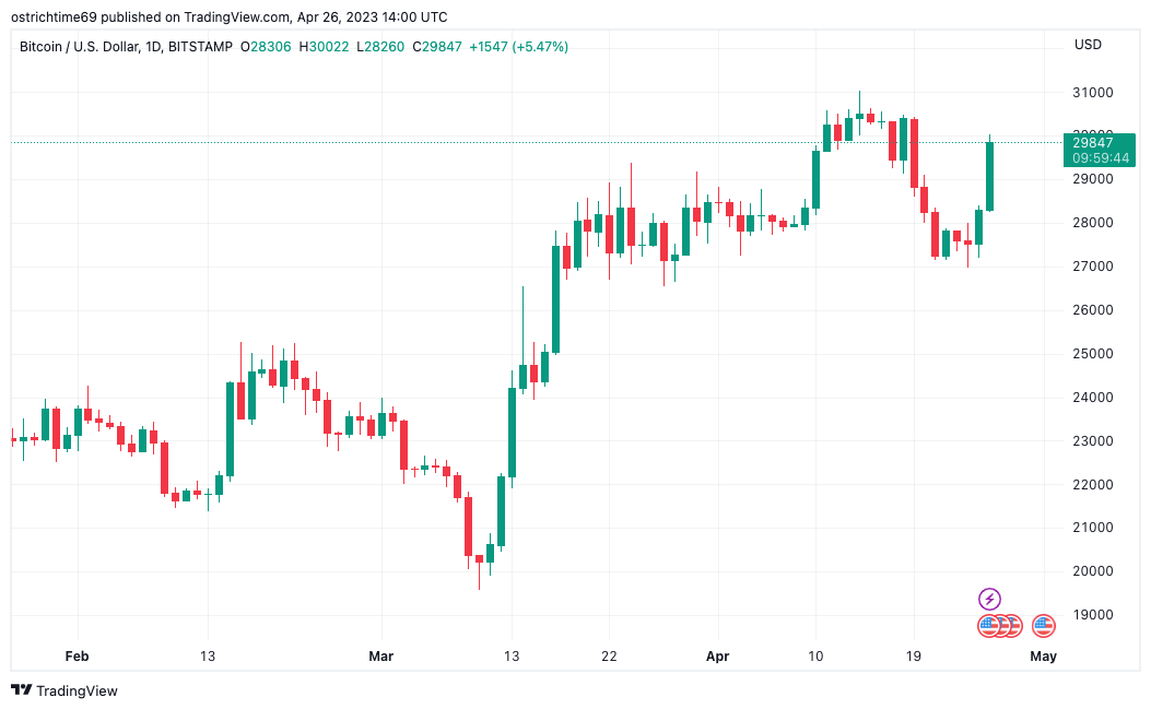 Bitcoin (BTC) tagged $30,000 into the April 26 Wall Street open as bulls gained further momentum from United States banking woes.