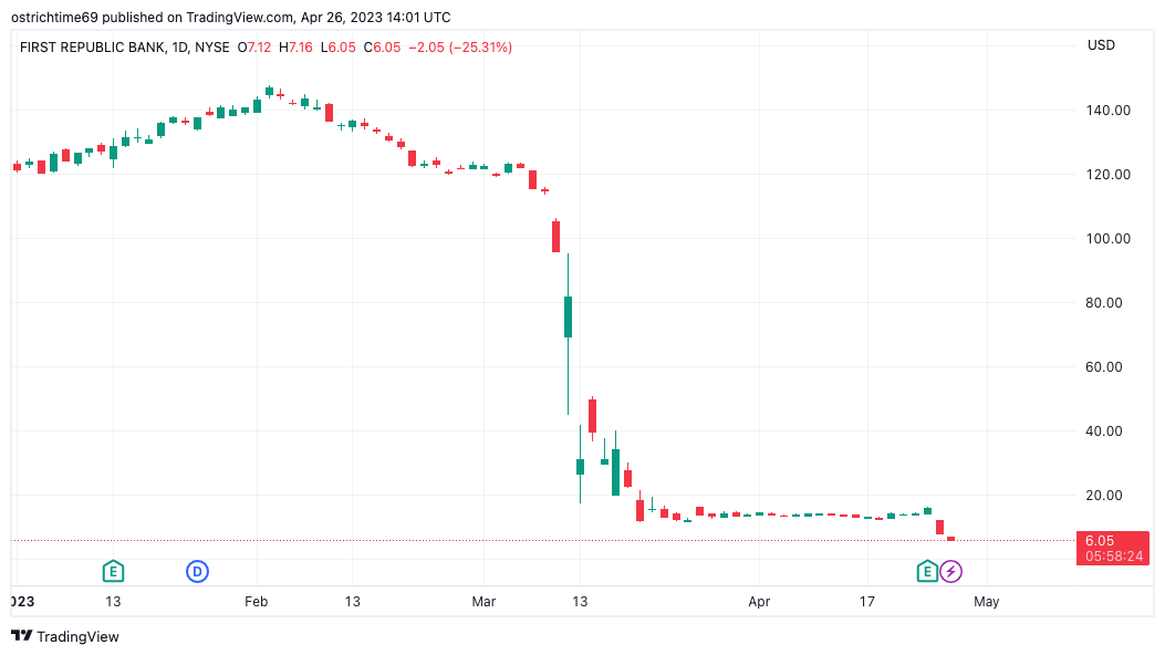 The U.S. government was reportedly uninterested in intervening on the day, according to a source cited by CNBC, as the bank’s stock, FRC, opened down another 22% before being halted for volatility. Weekly stock price losses thus totaled over 50%.