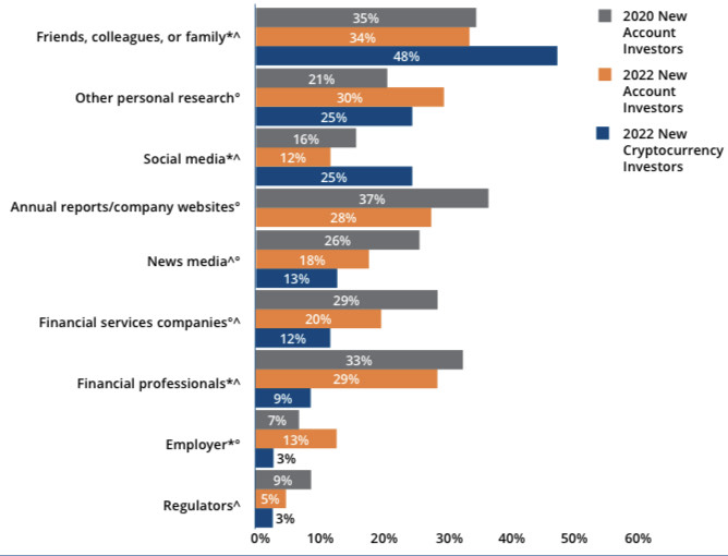 The survey also found that 48% of crypto investors said they sourced information about the digital asset market from friends, family or work colleagues — compared to 35% for stock investors — followed by social media at 25%.