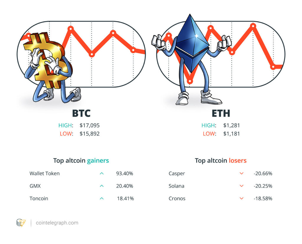 Bitcoin fell below $16,000 early in the week. The asset subsequently rallied back to $17,000, only to face rejection around the level on multiple occasions throughout the week, according to Cointelegraph’s BTC price index.