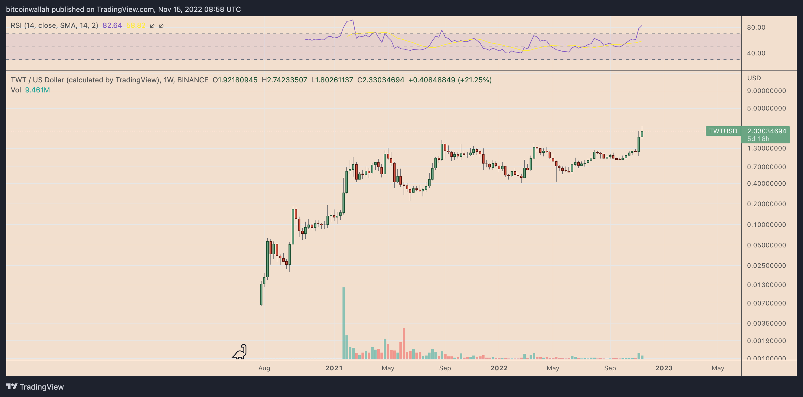 TWT’s price reached an intraday high of $2.43 on Nov. 15, a day after establishing a record high at nearly $2.75. At its lowest in 2022, the token was changing hands for $0.40, which makes it one of the year’s best-performing assets, with over 225% year-to-date gains.