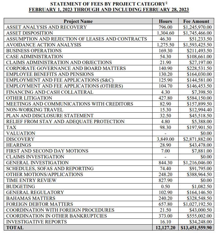 April 4 filings for the law firm Alvarez and Marsal and forensic investigation consultant Alix Partners detailed their February fee statements totaled over $11.9 million and around $3.6 million respectively.