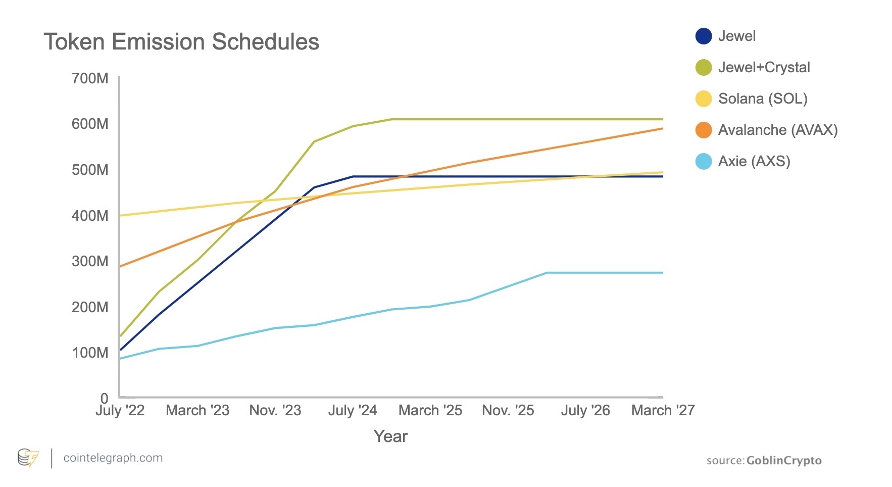 The decline comes amid a rapid expansion in circulating token supply, with DFK’s JEWEL supply expanding from roughly 60 million to more than 100 million over the same period. The supply stands to increase by 500% — to 500 million — by mid-2024, not including a new token — CRYSTAL — the game launched on the Avalanche (AVAX) chain.