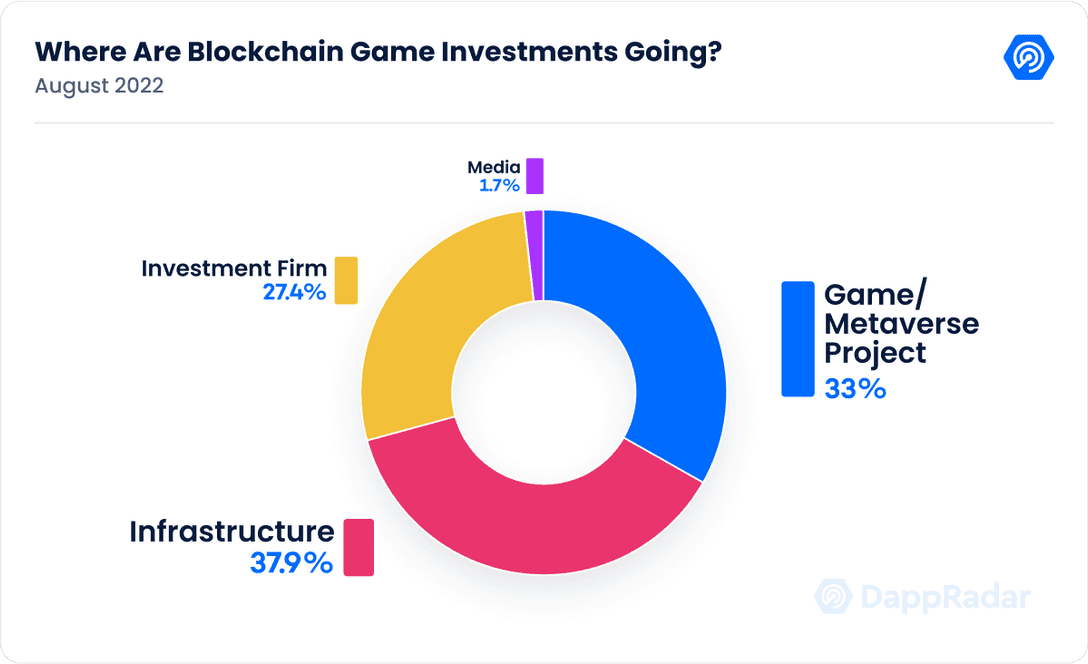 “Looking at the whole picture, we observed that 38% of the investments goes to infrastructure, 33% to games and metaverse projects, and 27% to investment firms,” the report stated.