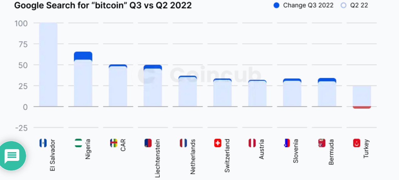 Among the top crypto-curious nations determined by the number of “Bitcoin” related searches, El Salvador topped the list again, followed by Nigeria and the Central African Republic.