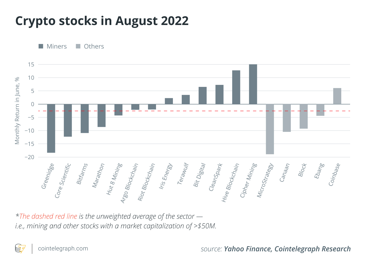Venture capital (VC) saw the continuation of the downtrend in investment capital in August, down over 31% from the previous month. It’s perhaps not a surprise, as firms look to remain risk-averse during these uncertain times, investing mostly in solid projects with long-term time horizons. This is a trend also seen in crypto stocks, with the graph below showing several companies with stocks with negative monthly returns.