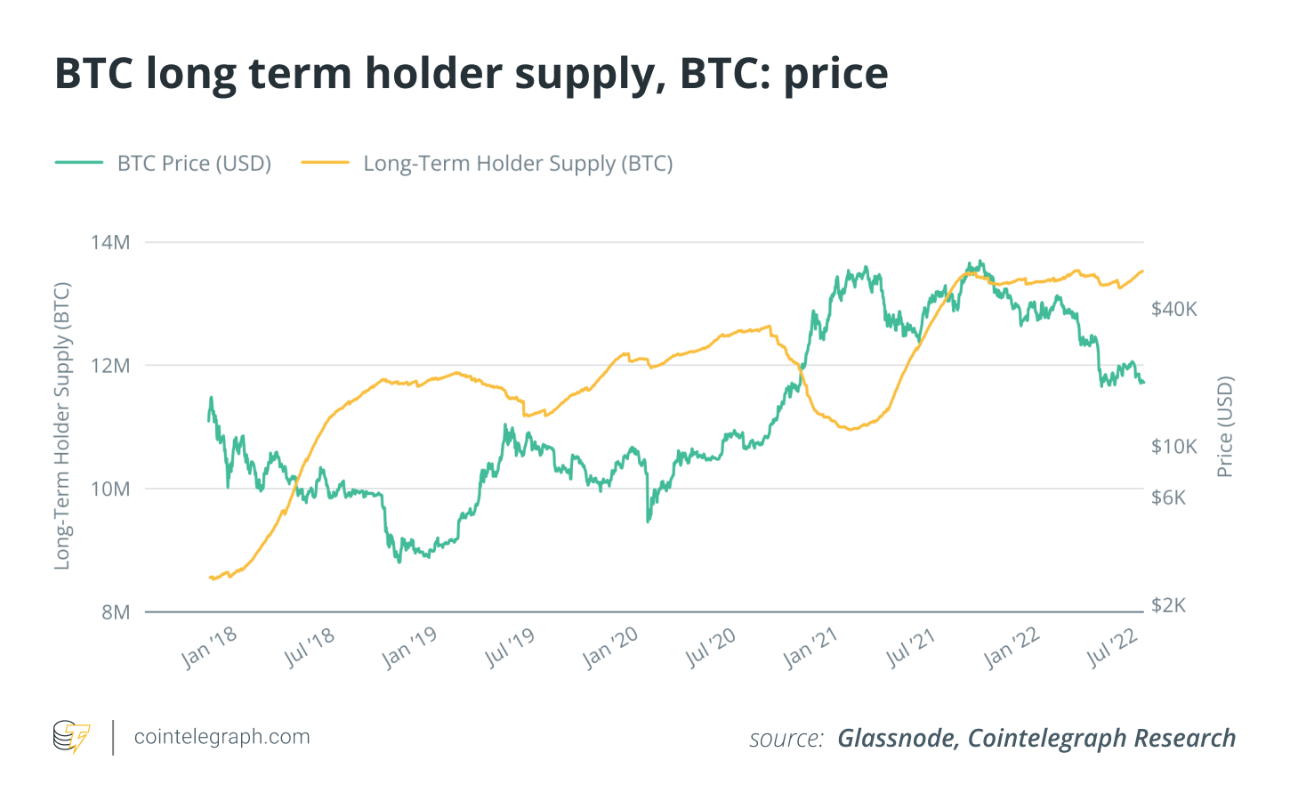 Such a high number marks a very bullish signal, giving insight into the supply that may be on the market in the future. This is only one side of the supply-and-demand equation, however, and crypto does not act in a vacuum outside of overall macroeconomic conditions. As can be seen in the chart below, BTC’s price went down even as supply left the market.