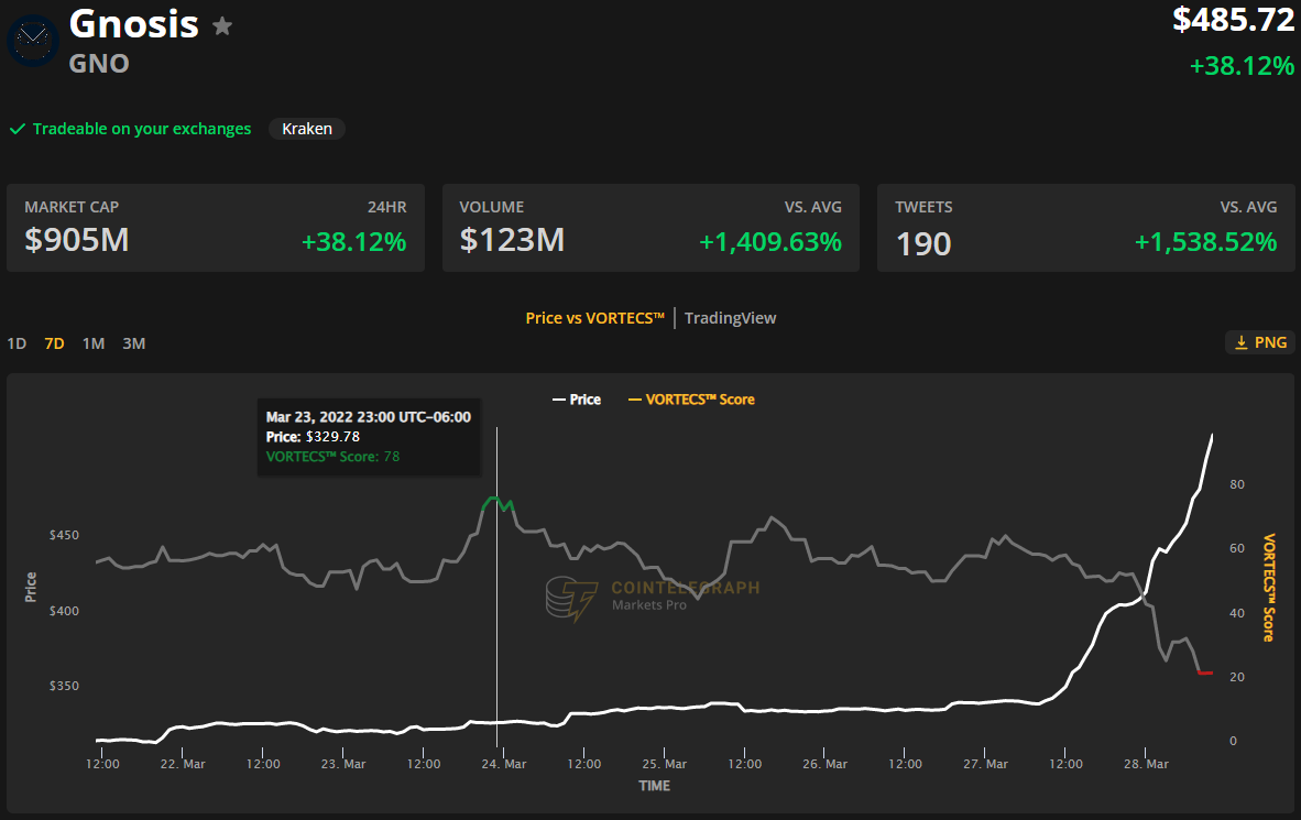 Data from Cointelegraph Markets Pro and TradingView shows that the price of GNO has gained 86% over the past seven days, rising from a low of $308 on March 21 to an intraday high at $574 on March 28.