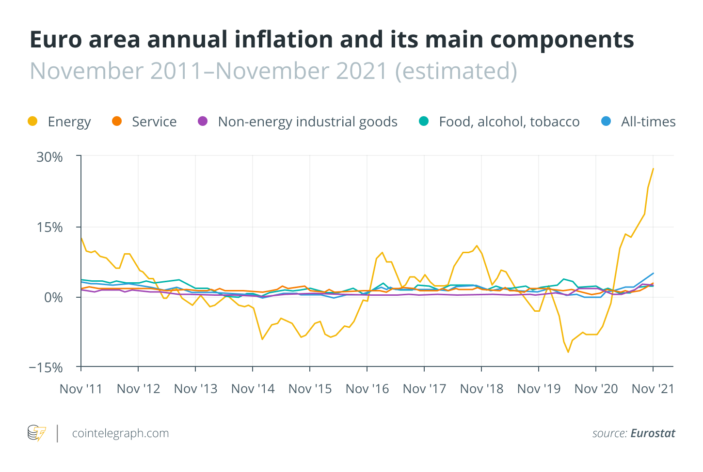 This expansionary monetary policy has long been believed to lead to higher inflation, defined as the devaluation of a payment vehicle amid the rising cost of goods and services. In November,inflation in the United States rose to a 30-year high while Eurozone inflation recorded the highest figure in the 25 years that data on it has been compiled.