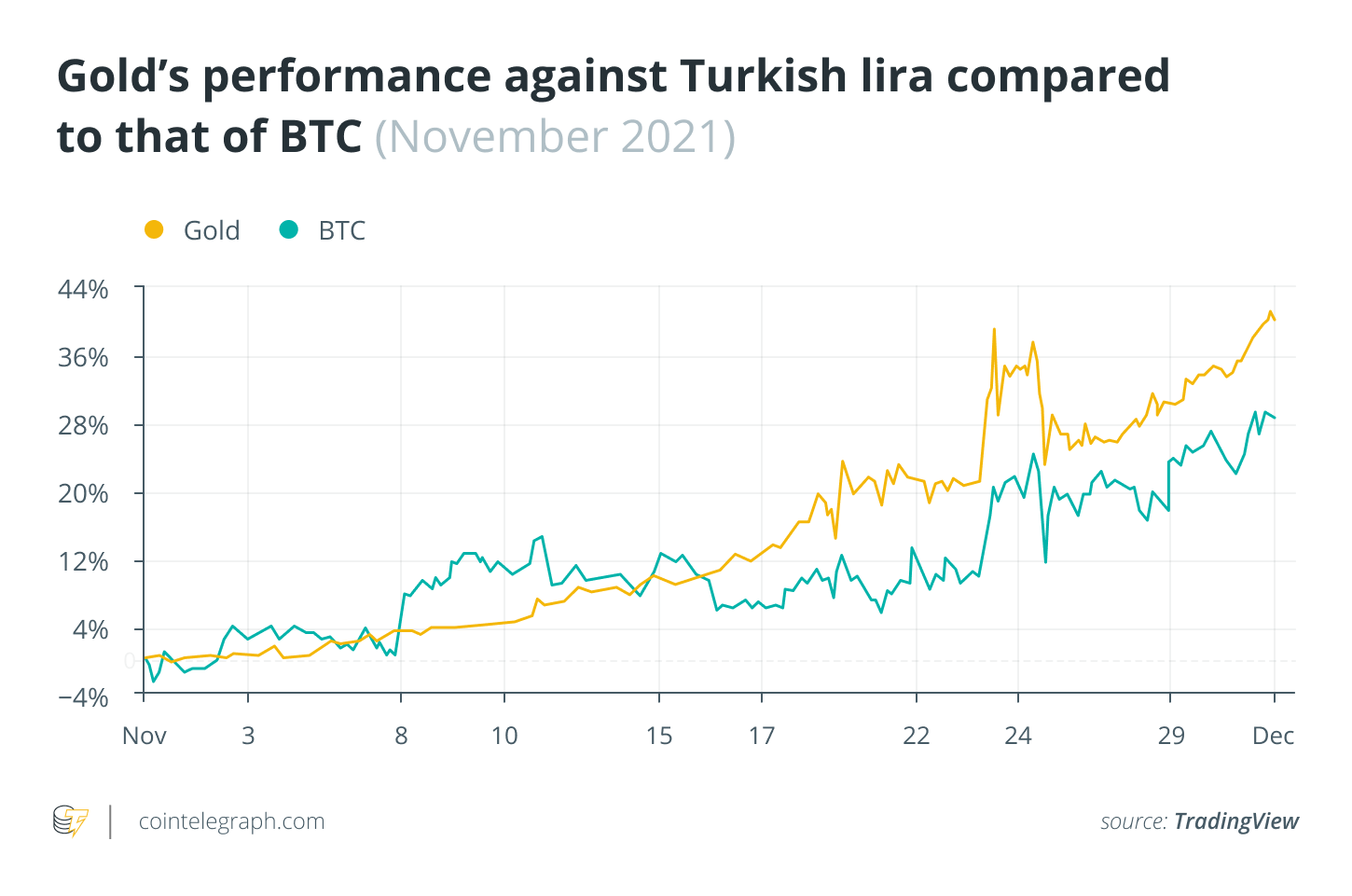 Speaking to Cointelegraph, Yuriy Kovalev, CEO and founder of crypto trading platform Zenfuse, said that while the lira’s freefall could have meant betting on gold was a good move, for U.S.-based investors it wasn’t: