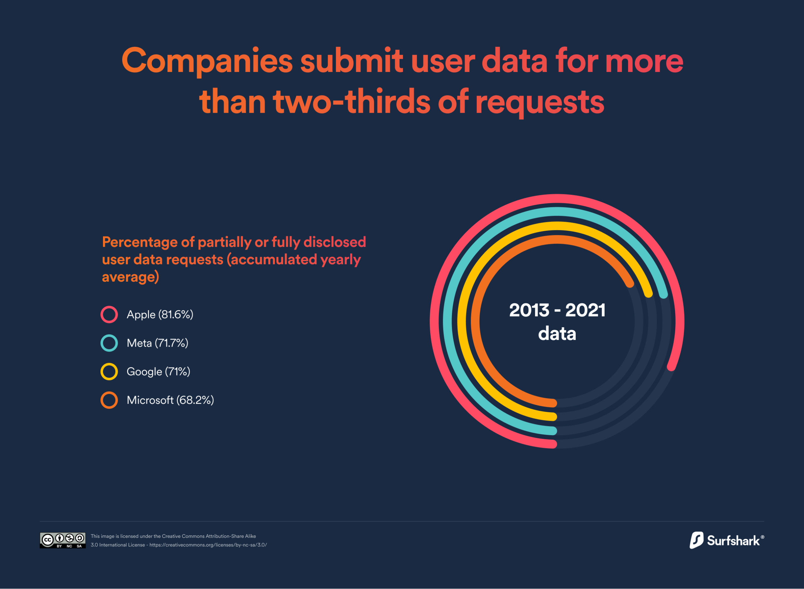On the part of the tech companies the rate of disclosure of user data has increased by nearly 71%. Apple leads the pack when it comes to disclosing such information with a disclosure rate of 86% in 2021, and an average disclosure rate of 82% across the study time period.