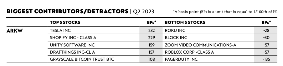 Other top assets by allocation include Jack Dorsey’s crypto-related platform Block, which is ranked fourth, and accounted for 7% of the ARKW’s total assets in Q2. Unlike GBTC, Block was among the top five worst performers for ARKW, dragging it down by 30 basis points in Q2.