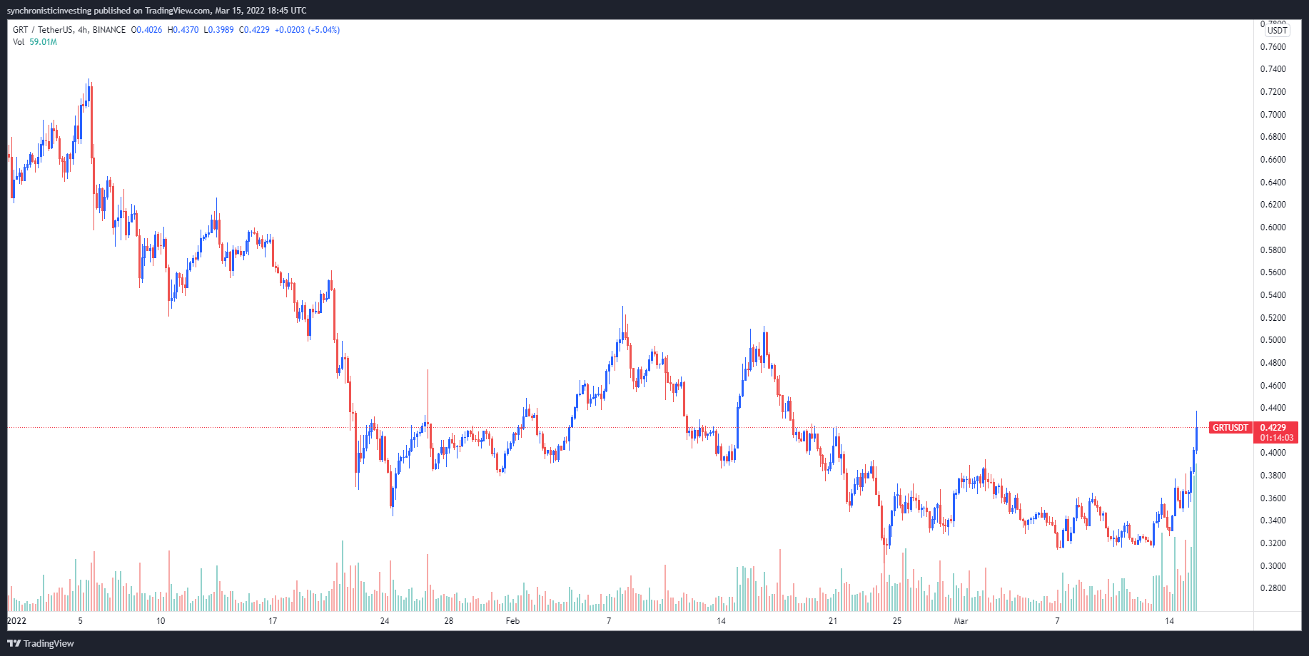Data from Cointelegraph Markets Pro and TradingView shows that since hitting a low of $0.3155 on March 13, GRT has climbed 38.6% to a daily high of $0.44 on March 15 where it is now attempting to flip this major resistance level into support.
